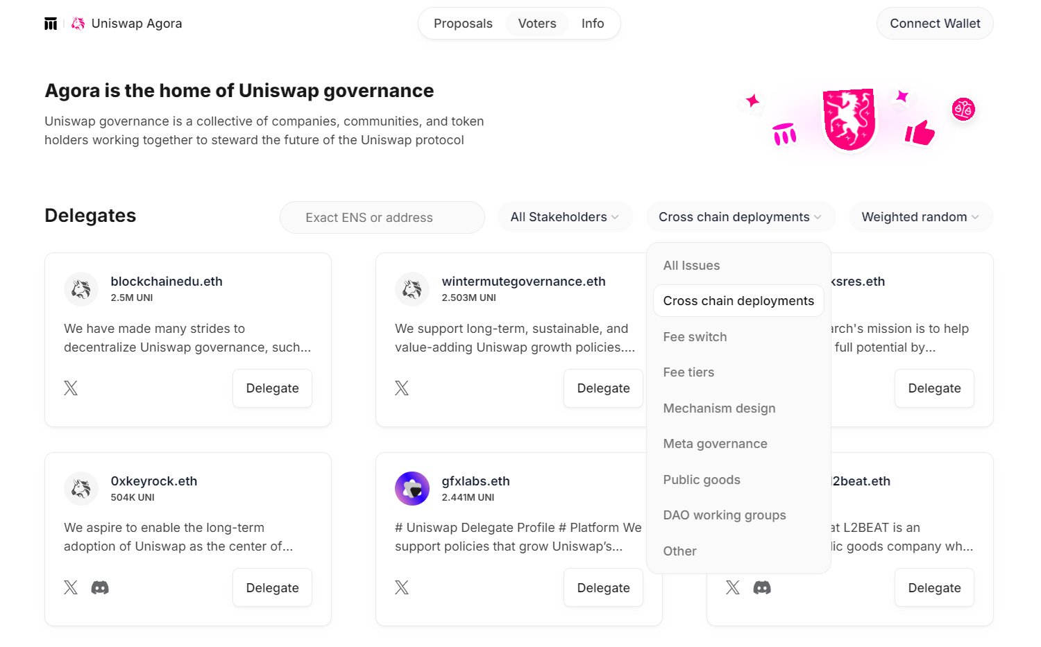If you are unsure of how best to vote and are interested in delegating your UNI voting power to another party, you can visit the Delegation Pitch section of the Governance Forum. Here parties participating in Uniswap Governance pitch their platform and voting agenda for users to read and discuss.