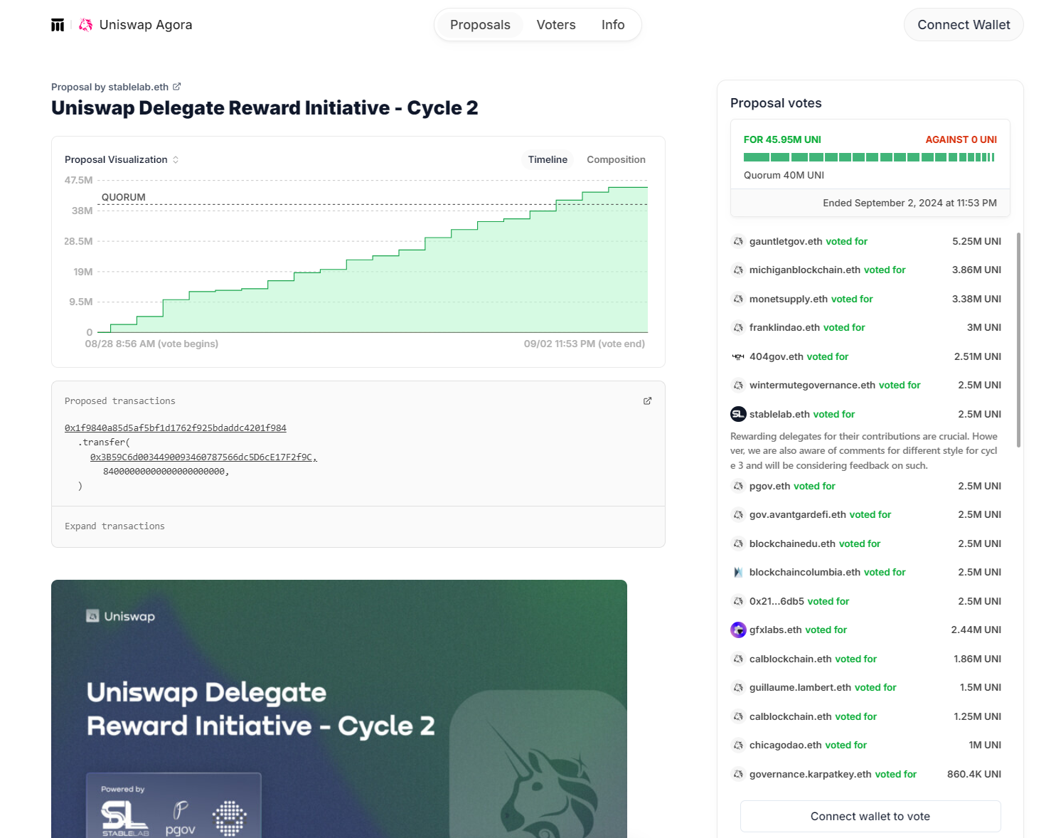 An important note: much like voter registration in a larger democracy, for UNI to be used in a vote it must be delegated before both the voting period. This means if you want your vote to count, you must delegate it in anticipation of any proposal you may be interested in.